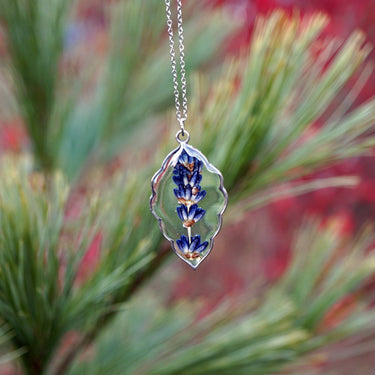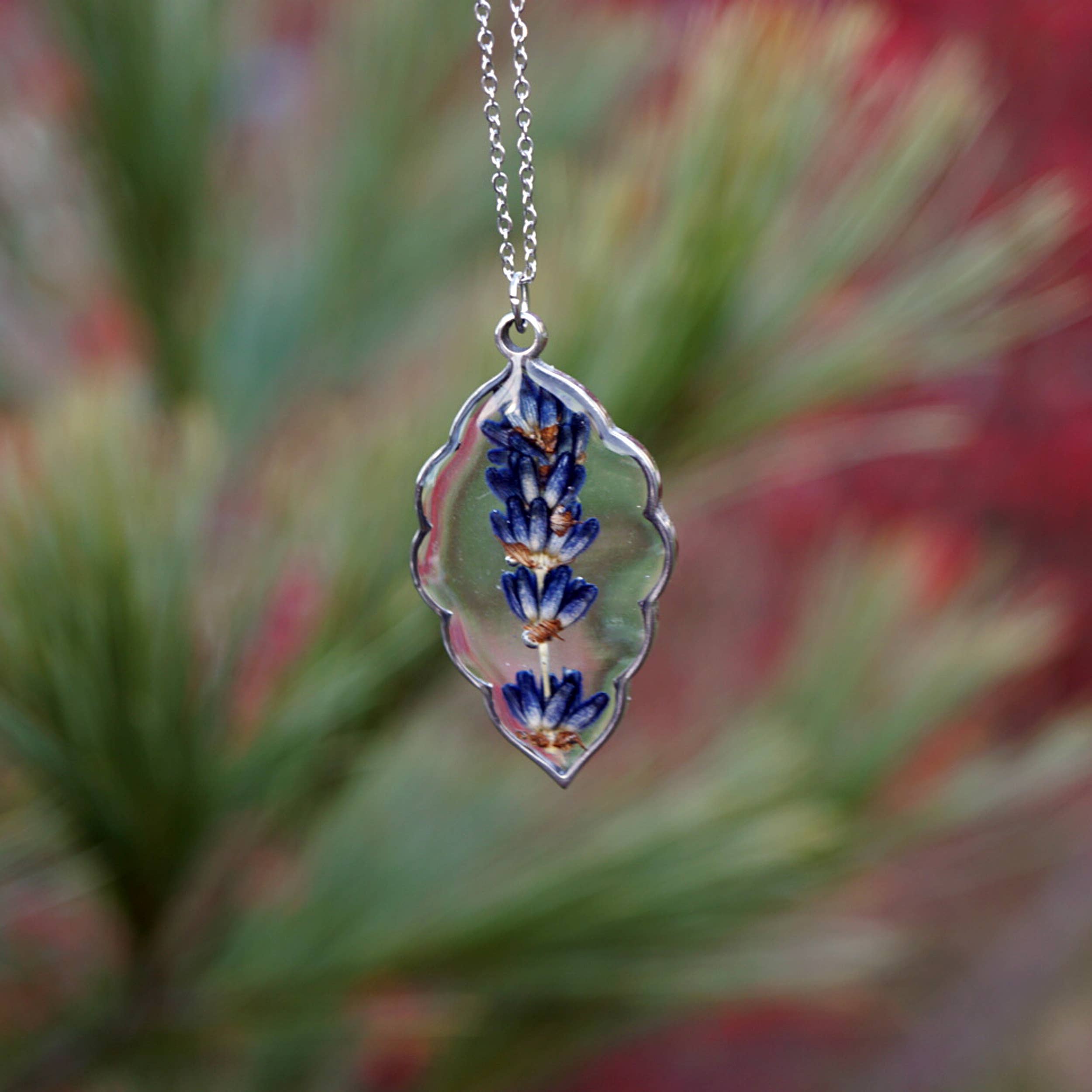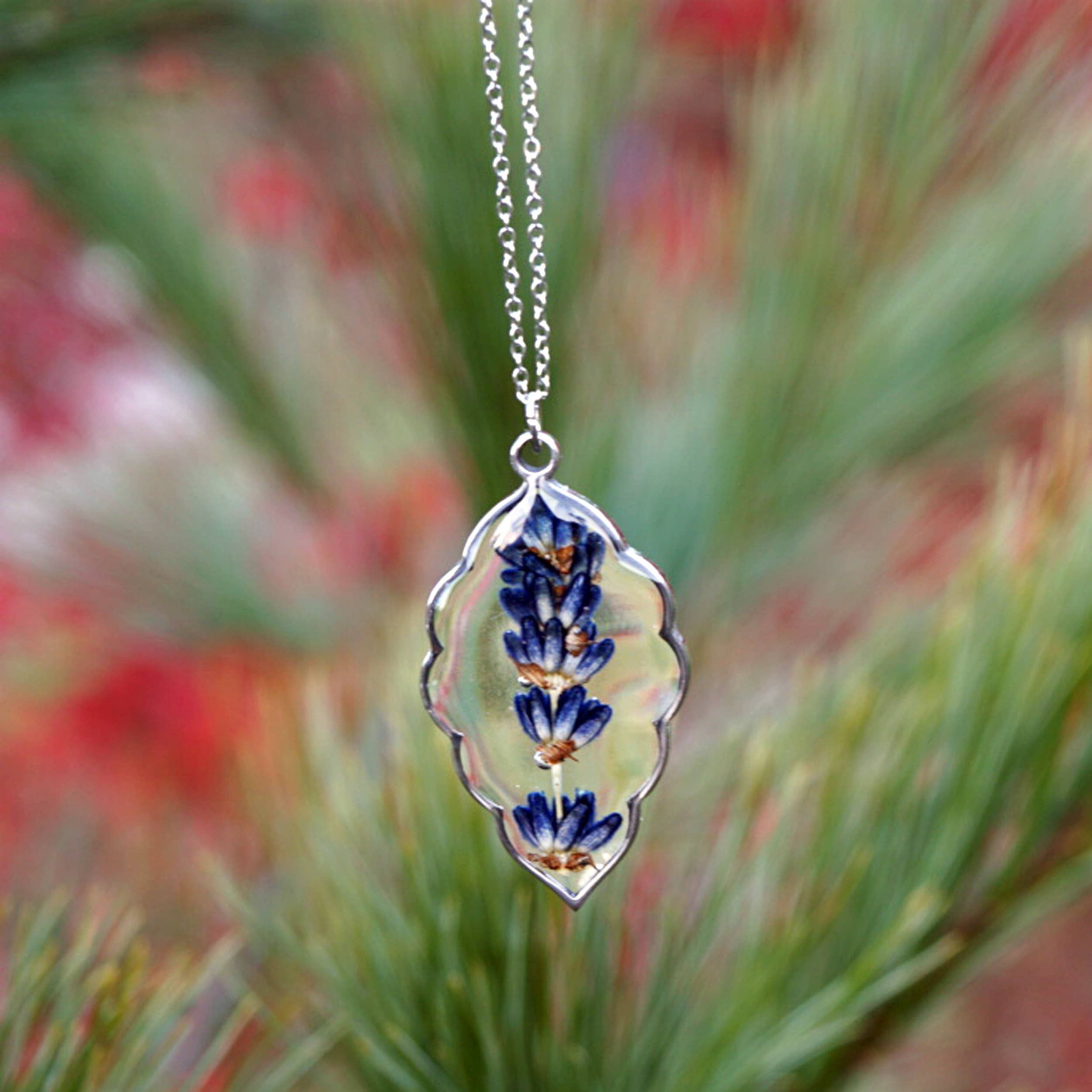 Real Lavender sprigs were hand gathered at a local lavender farm, pressed, and preserved in jewelry grade resin to make this beautiful pendant necklace.