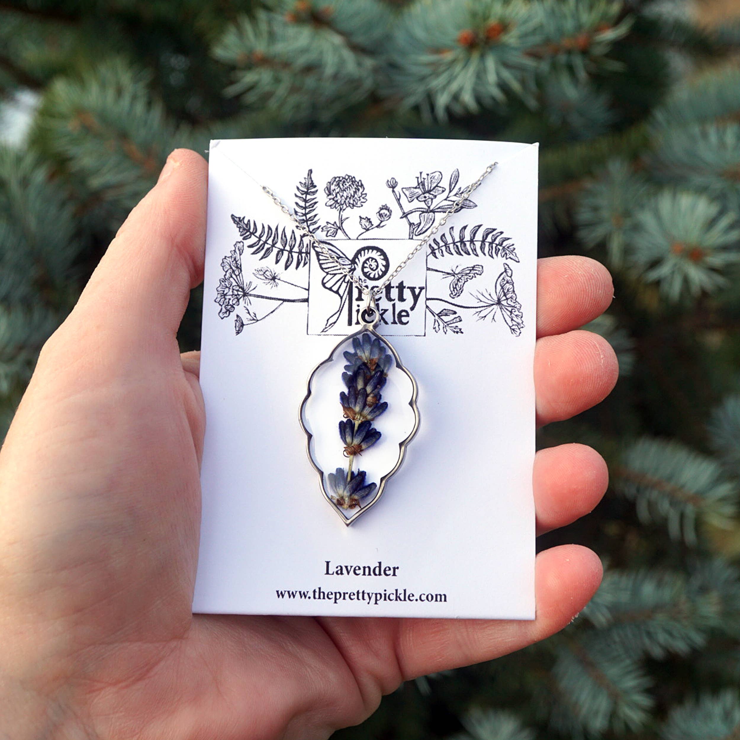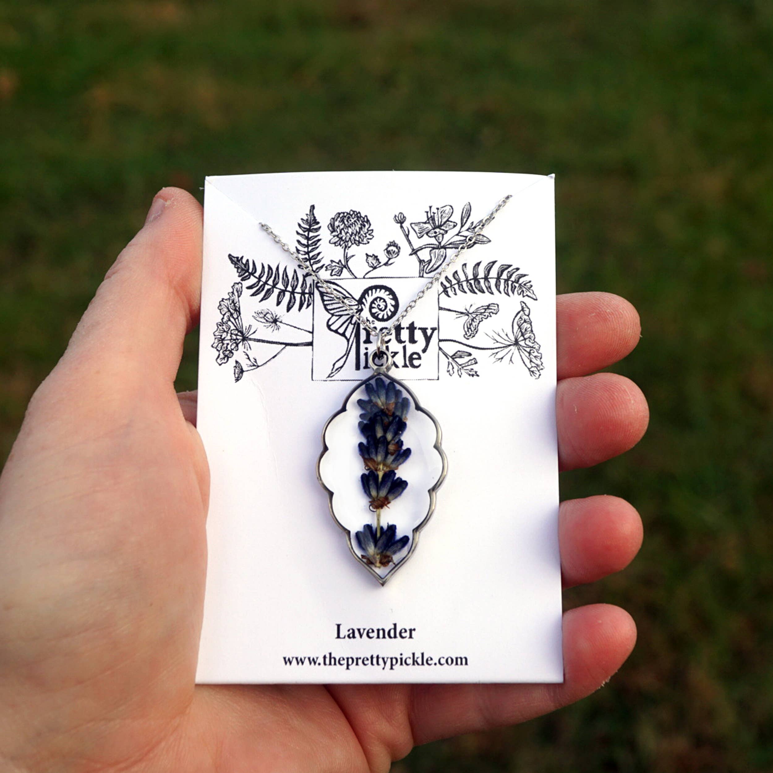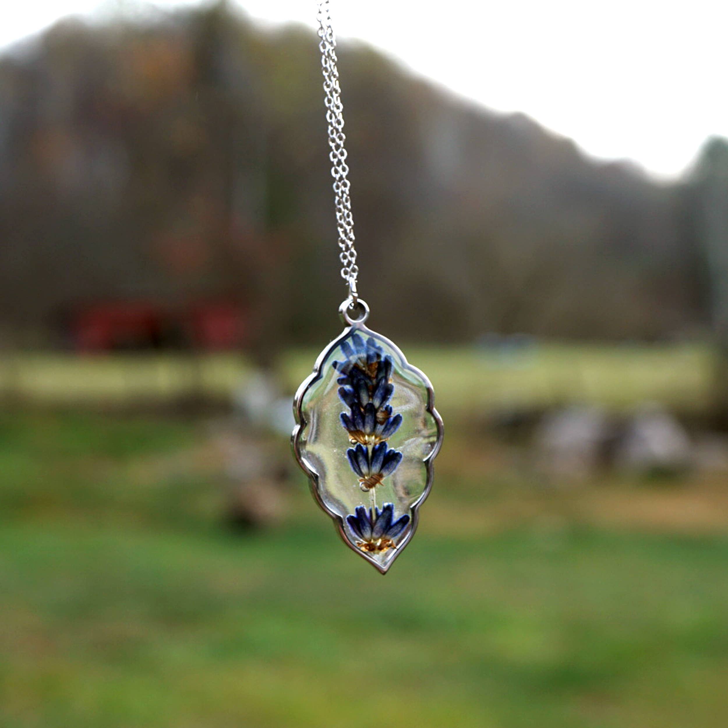 Each sprig of lavender is framed in a pointed oval scalloped edge shaped stainless steel bezel and hangs on a 24" matching chain. If you'd like another length, just leave a note at checkout!