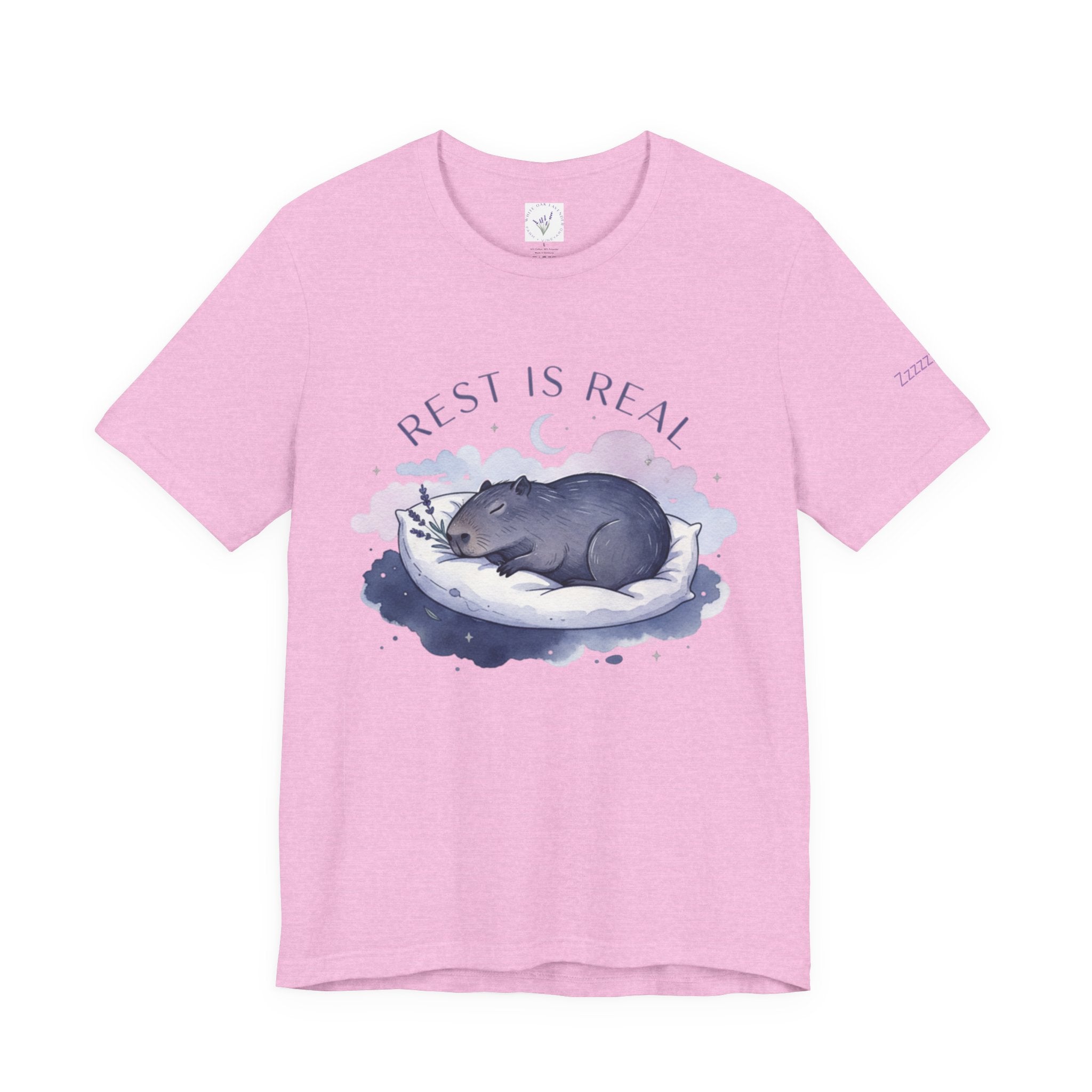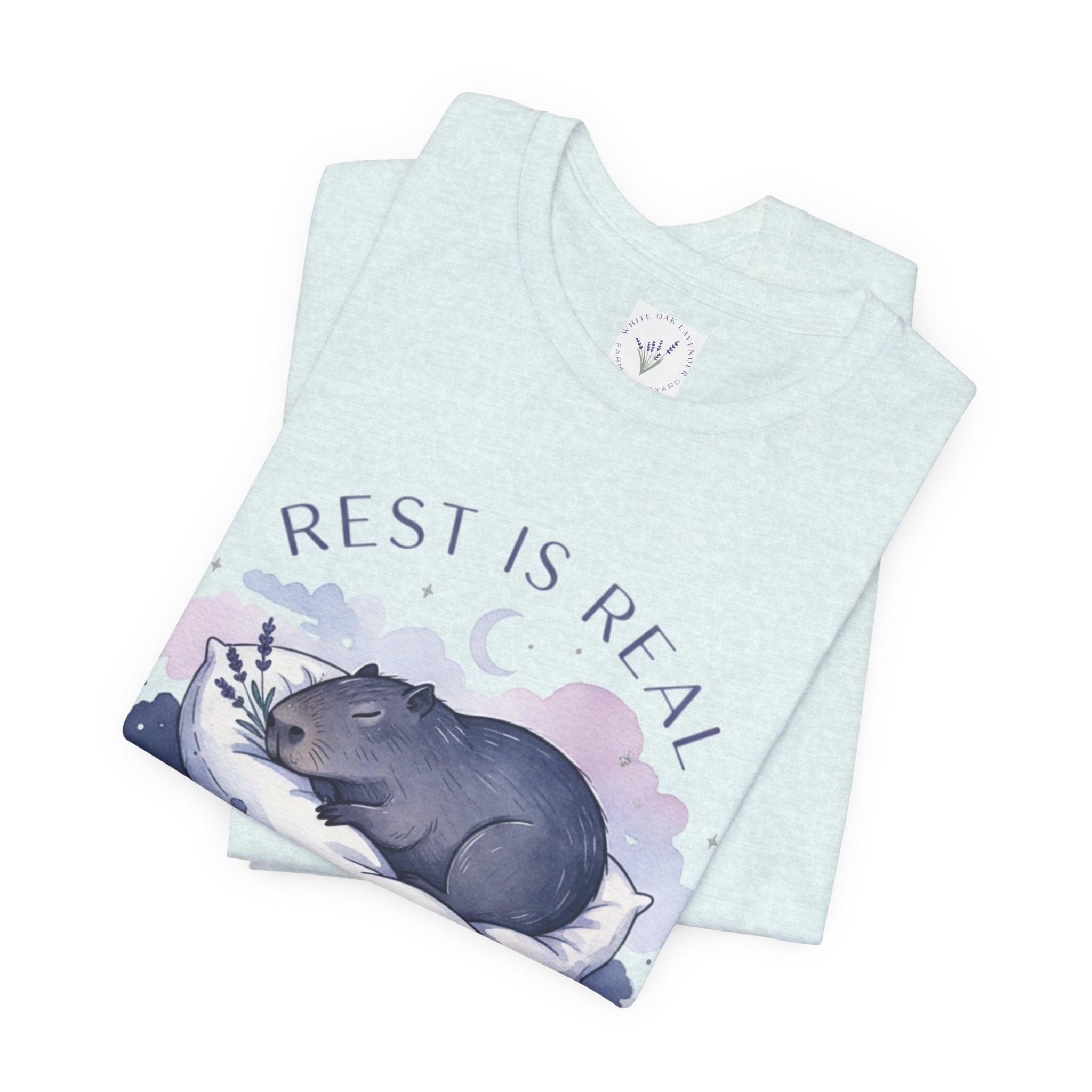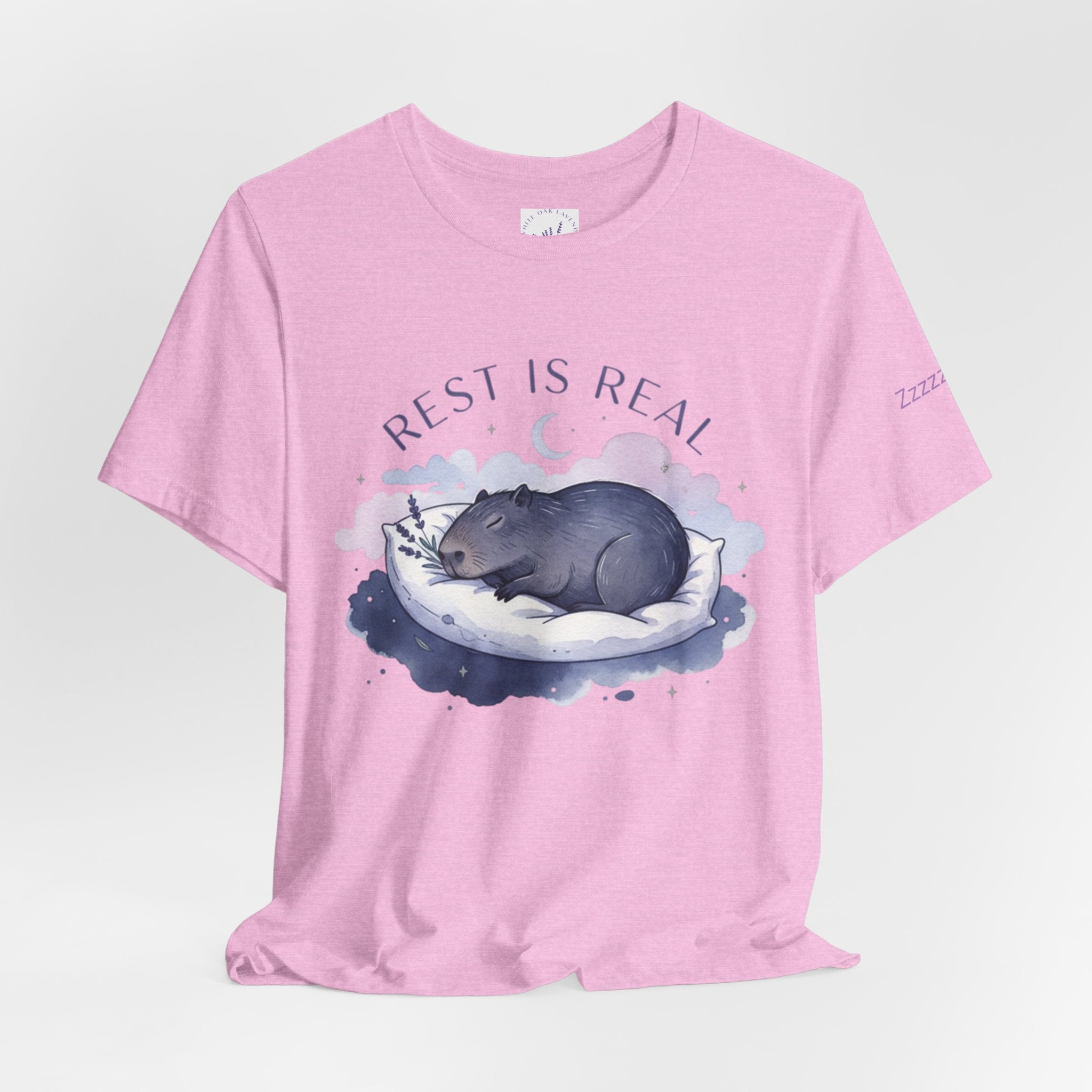 A soft, sleep-focused tee featuring a dreamy pastel illustration of a curled-up creature resting on a cloud and the gentle affirmation “Rest is Real.” Calm lavender and muted blue tones, airy rounded lettering, and subtle watercolor shading create a tranquil, anti-hustle vibe that aligns with the sleepmaxxing trend. Wear it as a quiet reminder to prioritize rest during winding-down routines, low-key outings, or cozy evenings at home. Product features - 100% Airlume combed and ring-spun cotton (Bella Canvas 3001), lightweight 4.2 oz/yd² - Retail fit with crew neckline and ribbed knit collar with seam - With side seams and shoulder tape for improved shape retention - Sleeve and neck label printed using DTF/DTG techniques for crisp, detailed designs - Tear-away label; REACH certified; sourced from Honduras; adult sizing Care instructions - Machine wash: cold (max 30C or 90F) - Non-chlorine: bleach as needed - Tumble dry: low heat - Iron, steam or dry: medium heat - Do not dryclean