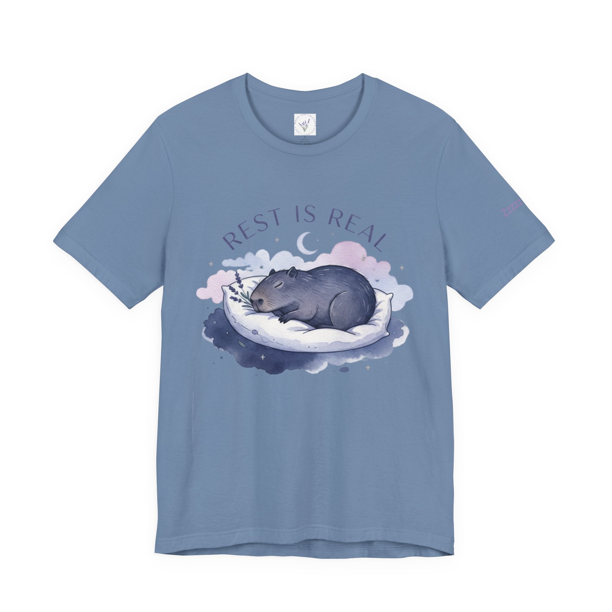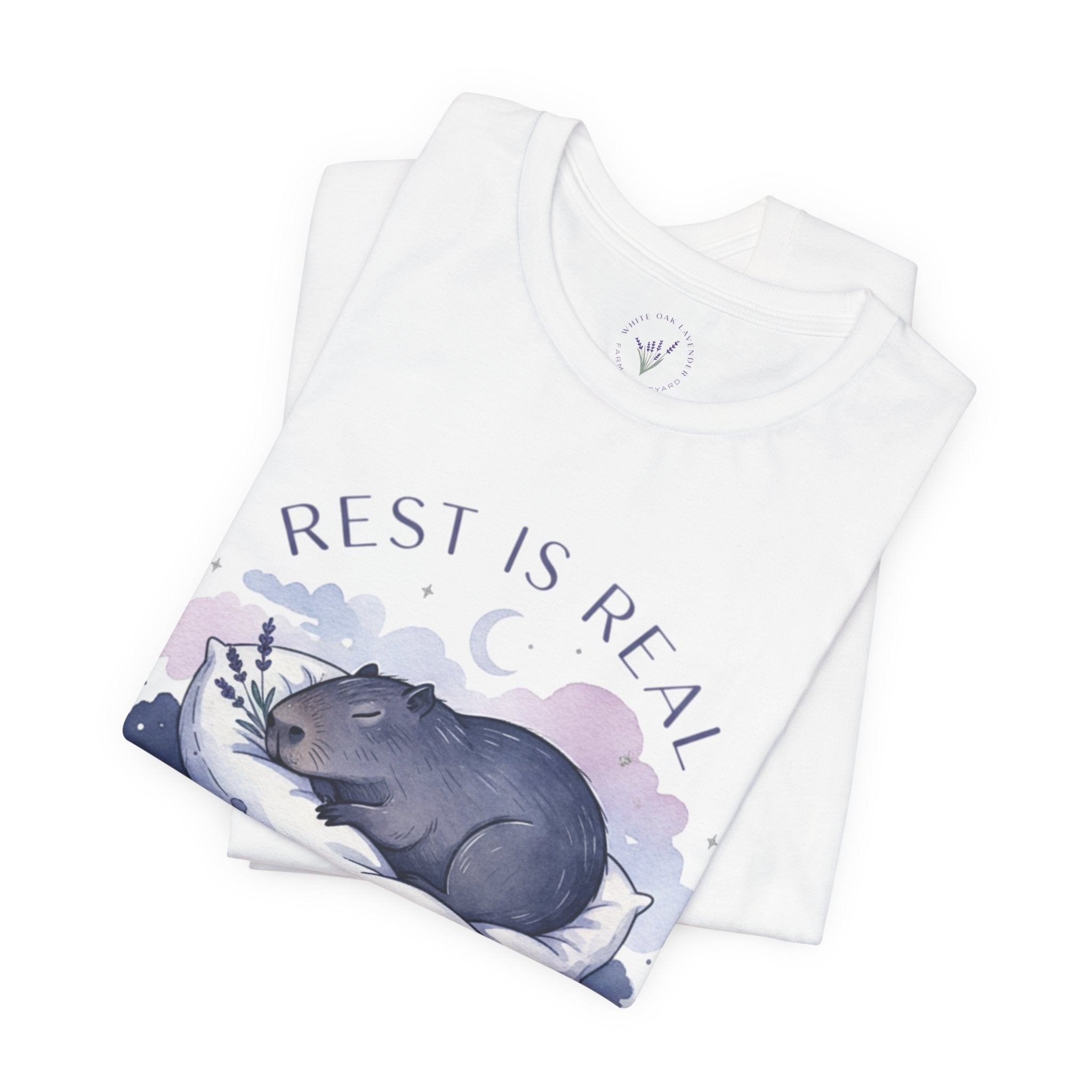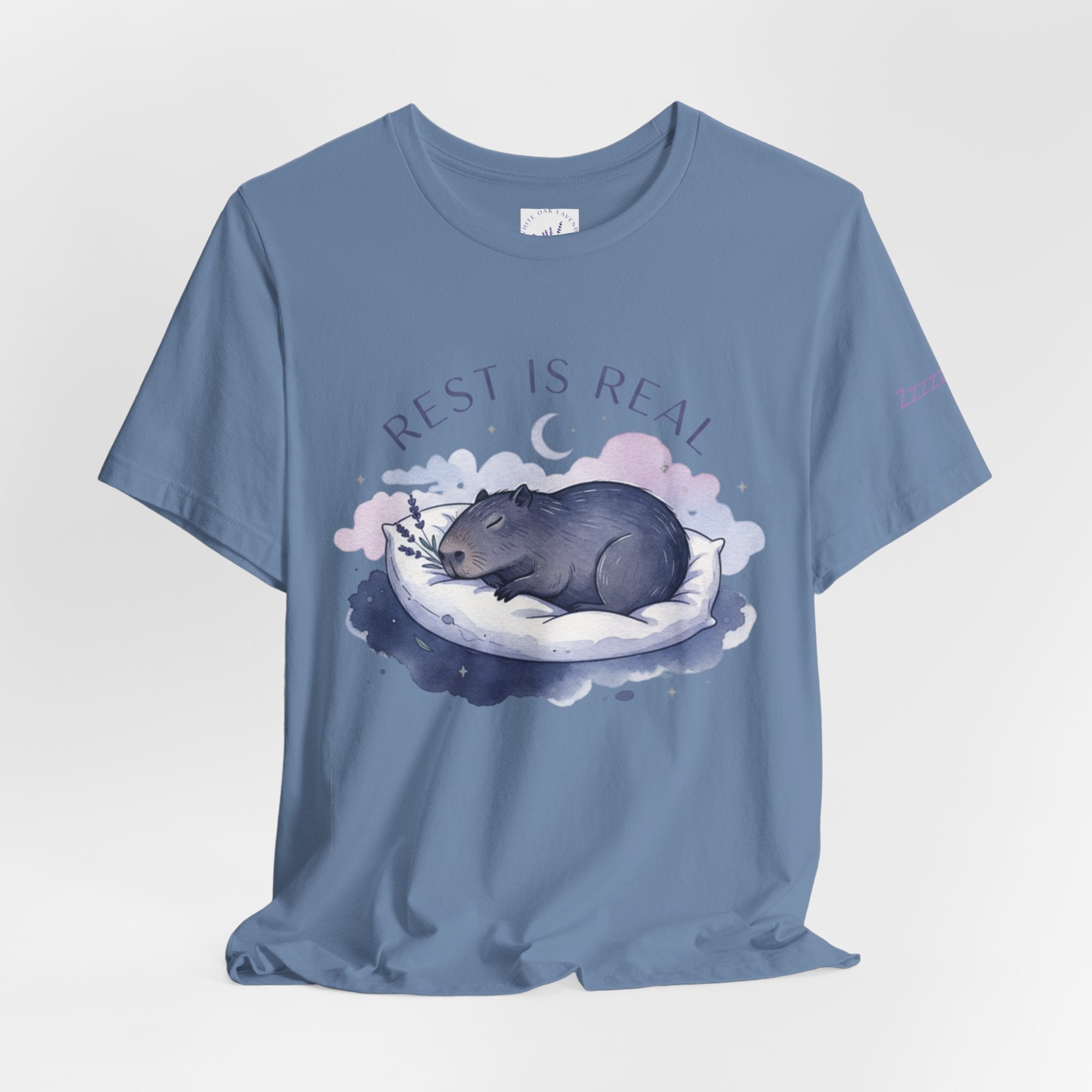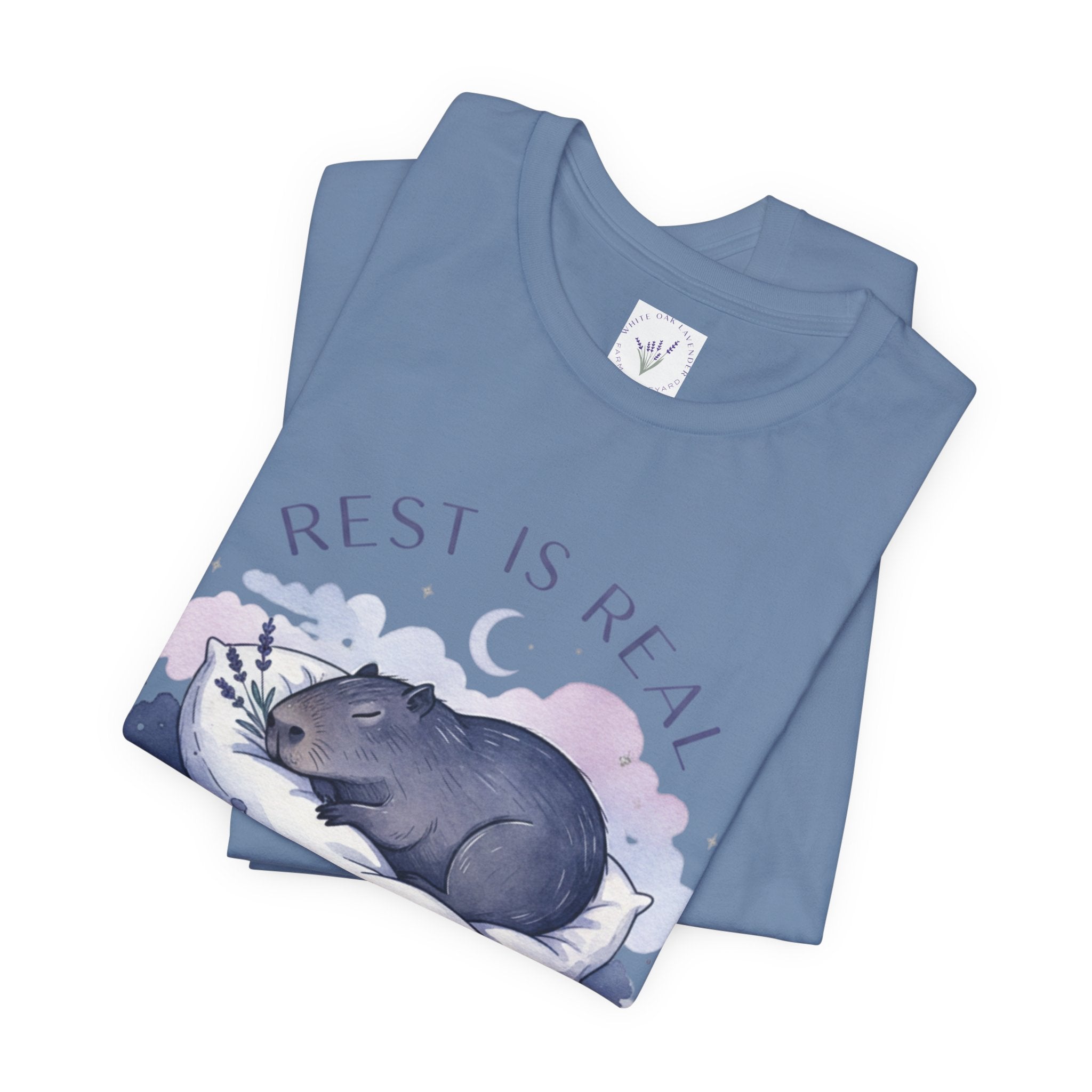 A soft, sleep-focused tee featuring a dreamy pastel illustration of a curled-up creature resting on a cloud and the gentle affirmation “Rest is Real.” Calm lavender and muted blue tones, airy rounded lettering, and subtle watercolor shading create a tranquil, anti-hustle vibe that aligns with the sleepmaxxing trend. Wear it as a quiet reminder to prioritize rest during winding-down routines, low-key outings, or cozy evenings at home. Product features - 100% Airlume combed and ring-spun cotton (Bella Canvas 3001), lightweight 4.2 oz/yd² - Retail fit with crew neckline and ribbed knit collar with seam - With side seams and shoulder tape for improved shape retention - Sleeve and neck label printed using DTF/DTG techniques for crisp, detailed designs - Tear-away label; REACH certified; sourced from Honduras; adult sizing Care instructions - Machine wash: cold (max 30C or 90F) - Non-chlorine: bleach as needed - Tumble dry: low heat - Iron, steam or dry: medium heat - Do not dryclean