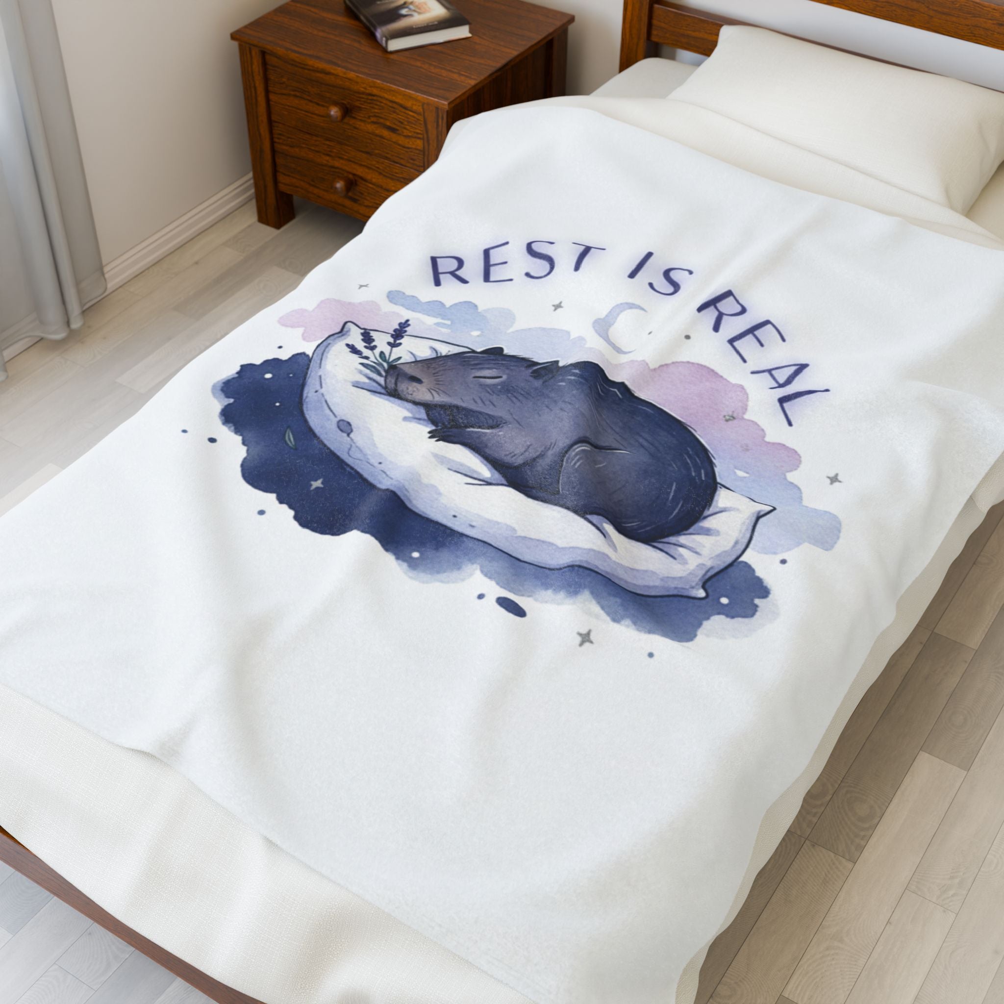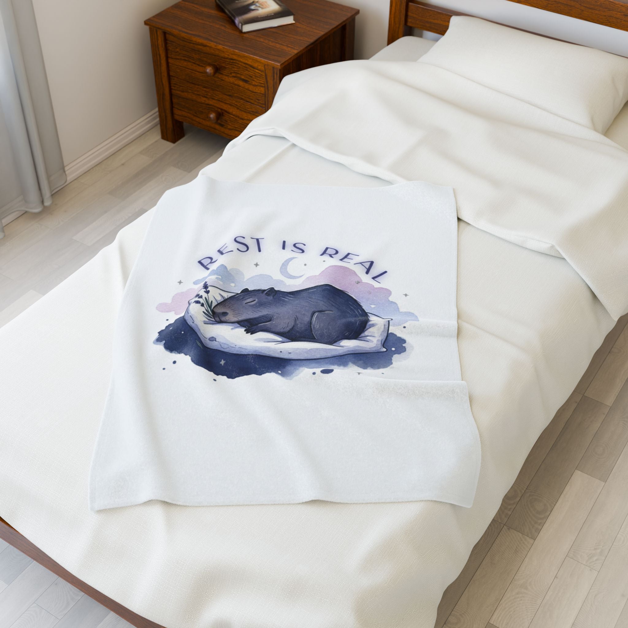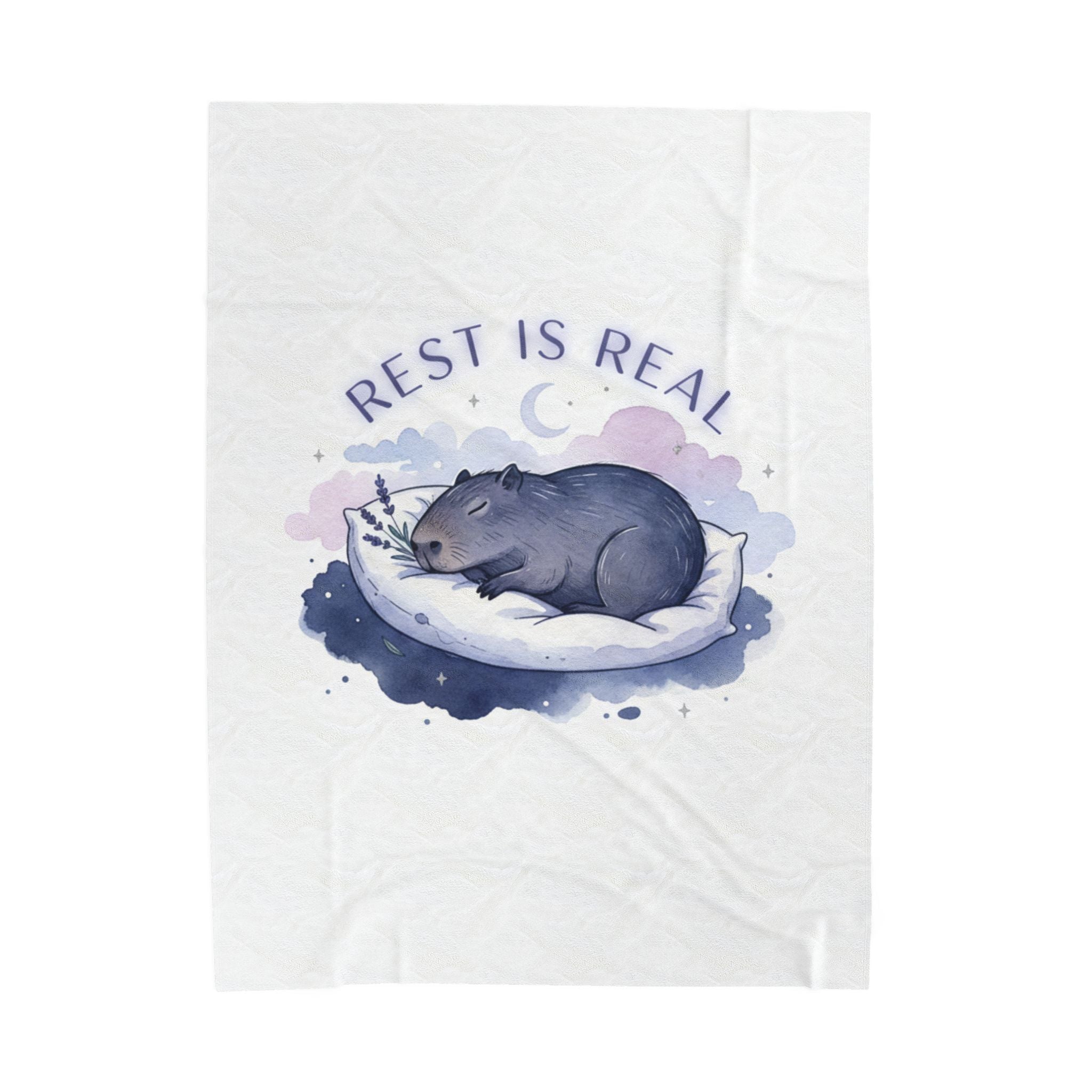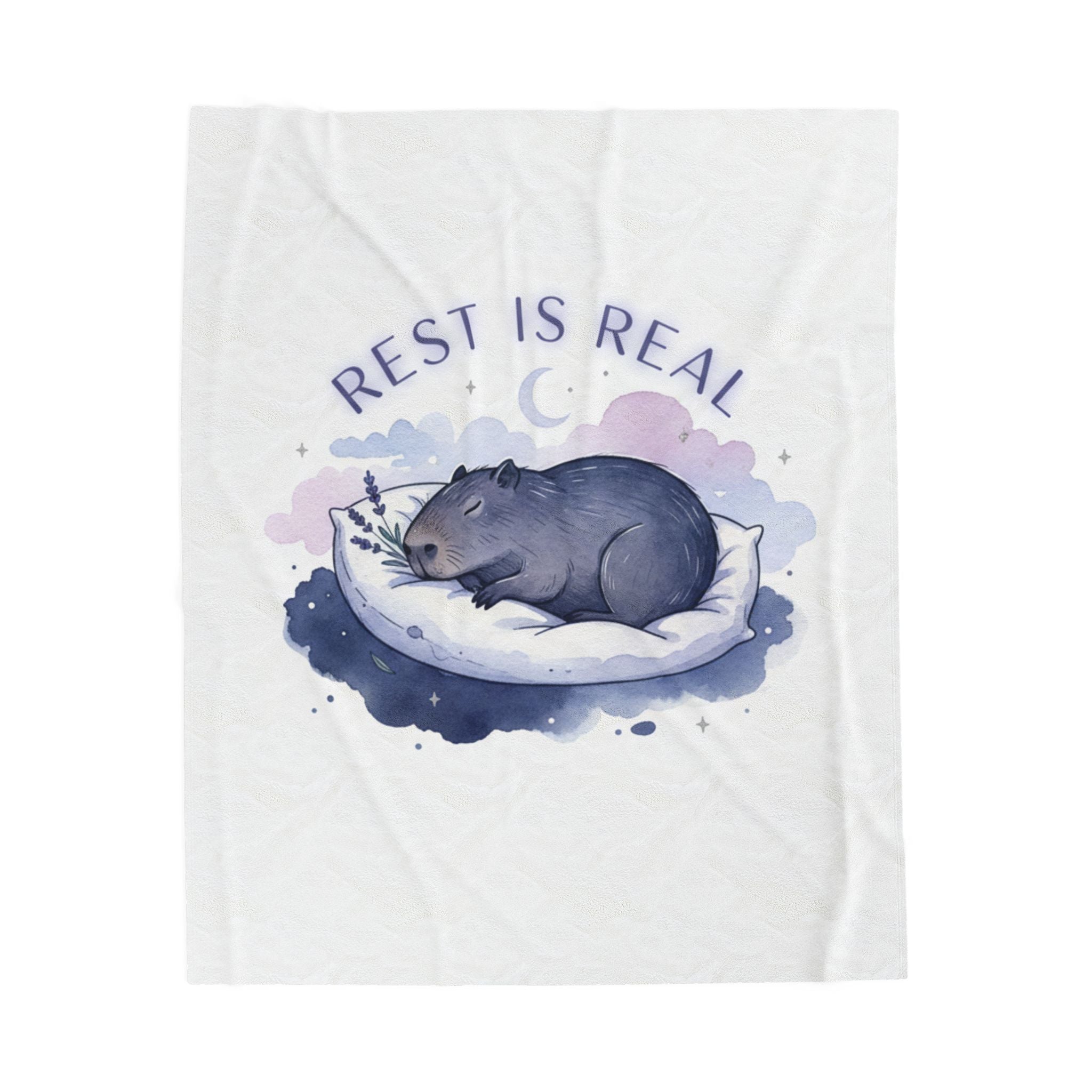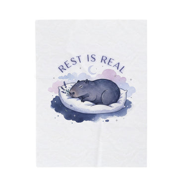 A soft, sleep-focused plush blanket featuring a gentle nocturnal illustration and a calming affirmation that aligns with the sleepmaxxing trend. The artwork shows a curled, peaceful animal tucked into a crescent-shaped pillow with a muted watercolor halo in lavender and pastel blue, and the phrase “Rest is real” in an airy, curved type. The overall vibe is quiet and validating—meant to support bedtime routines, winding-down moments, and restful rituals for anyone leaning into rest-as-ambition.
