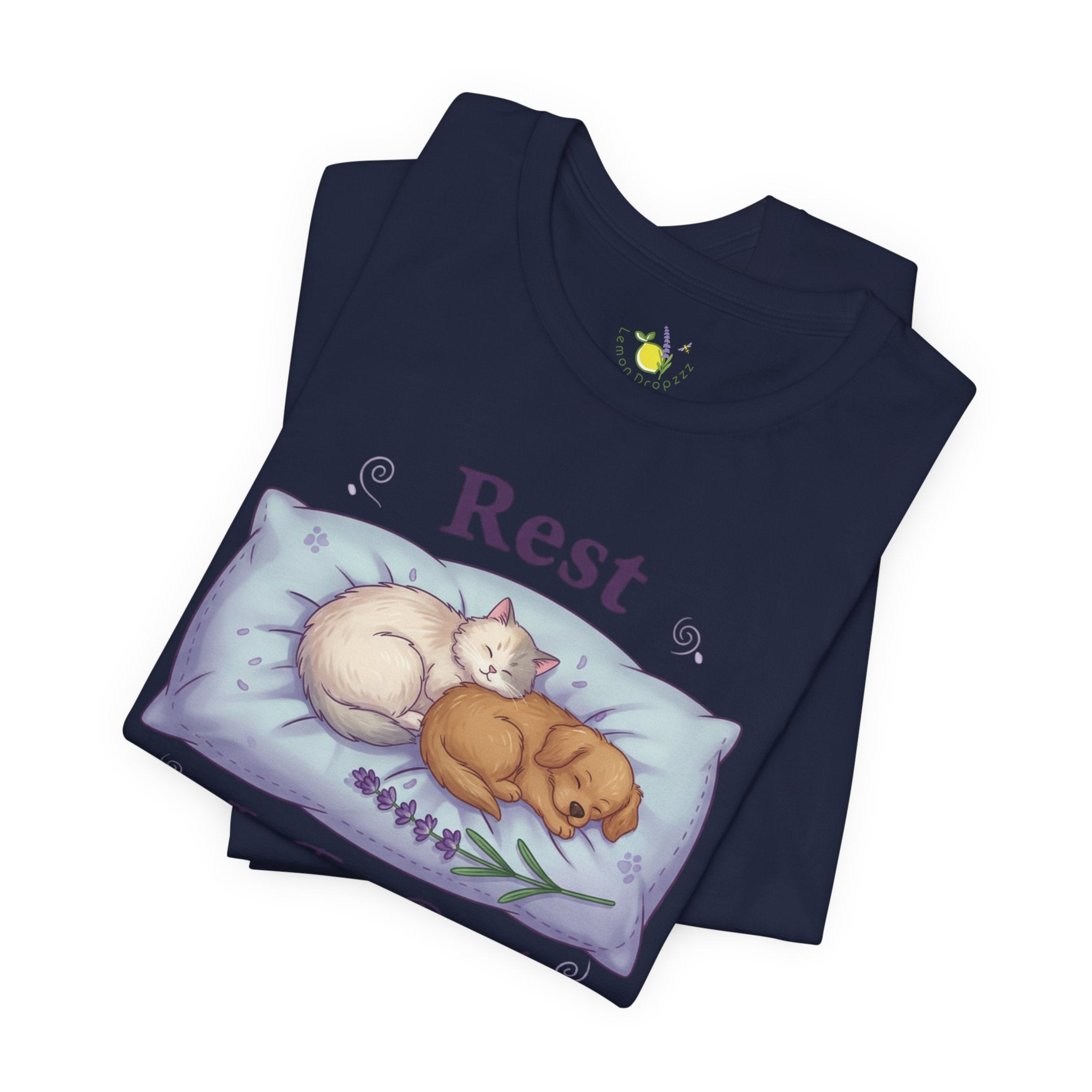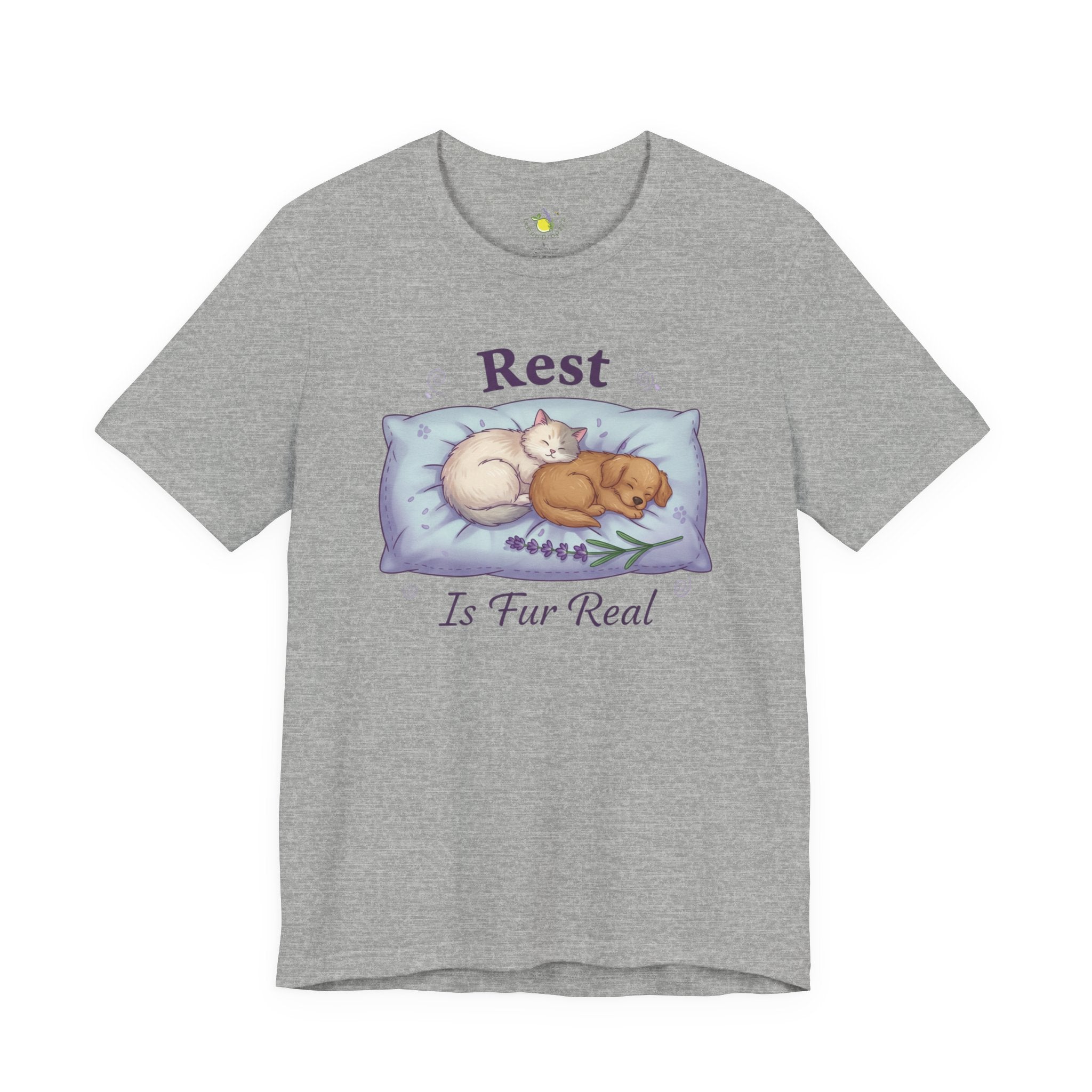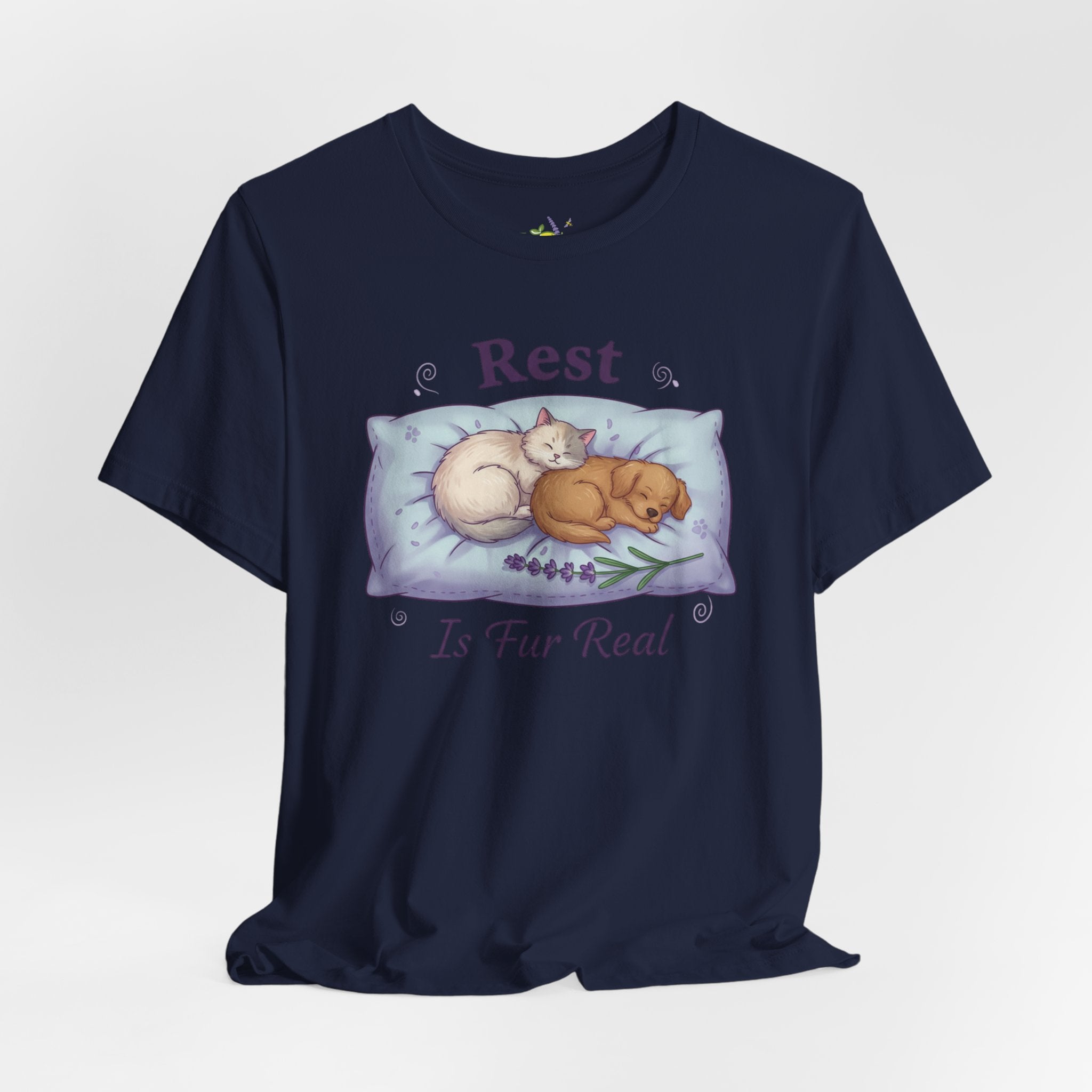 Soft, sleep-forward tee featuring a gentle illustration of two curled-up pets on a plush pillow with the calming reminder “Rest Is Fur Real.” Pastel lavender and muted gray tones, airy linework, and a relaxed retail fit make this shirt fall into the sleepmaxxing/rest-as-ambition mood — a quiet wearable nudge toward better sleep routines and self-care. The understated imagery and soothing palette help the wearer signal a restorative mindset without loud slogans, pairing well with loungewear or layered under a cardigan for relaxed days at home or low-key outings. Product features - Made from 100% Airlume combed and ring-spun cotton (Bella+Canvas 3001), lightweight 4.2 oz/yd² - Retail fit with crew neckline and tear-away label - Construction: side seams, shoulder tape, ribbed knit collar with seam - Printing: sleeve and neck label printing via DTF/DTG methods for crisp, detailed designs - Compliance: REACH certified; Age restriction: for adults; Country of origin: Honduras Care instructions - Machine wash: cold (max 30C or 90F) - Non-chlorine: bleach as needed - Tumble dry: low heat - Iron, steam or dry: medium heat - Do not dryclean