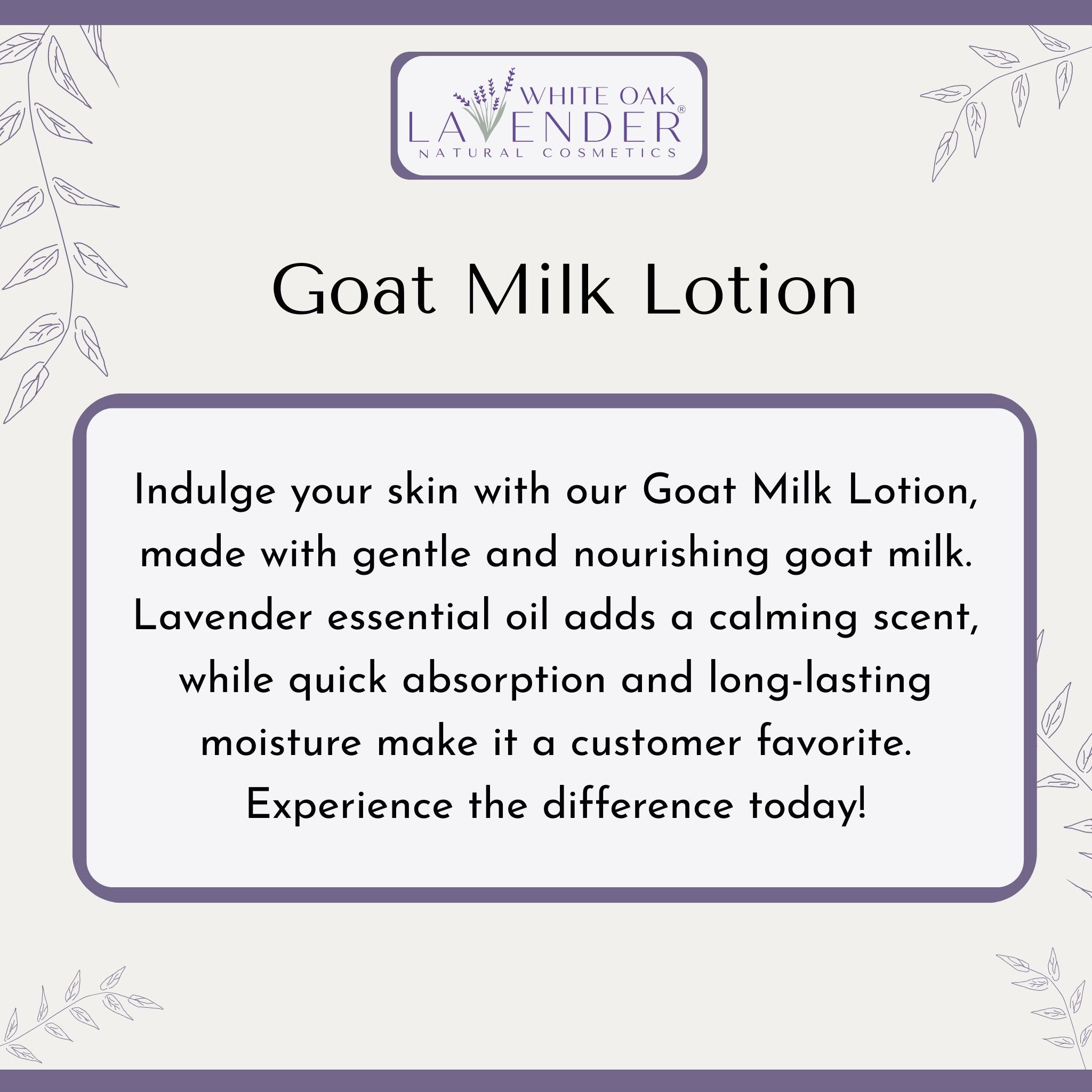 Indulge your skin with our Goat Milk Lotion, made with gentle and nourishing goat milk. Lavender essential oil adds a calming scent, while quick absorption and long-lasting moisture make it a customer favorite. Experience the difference today!