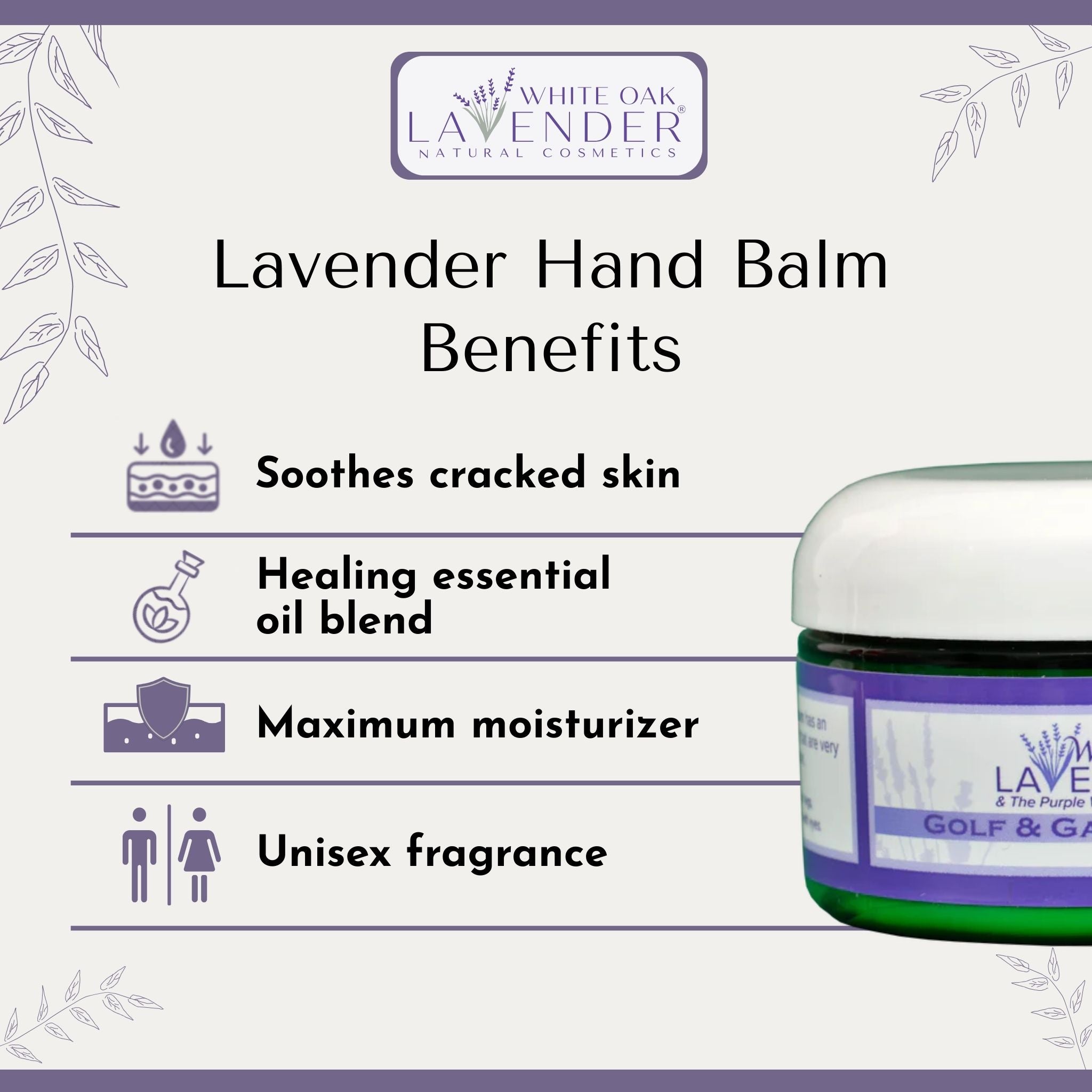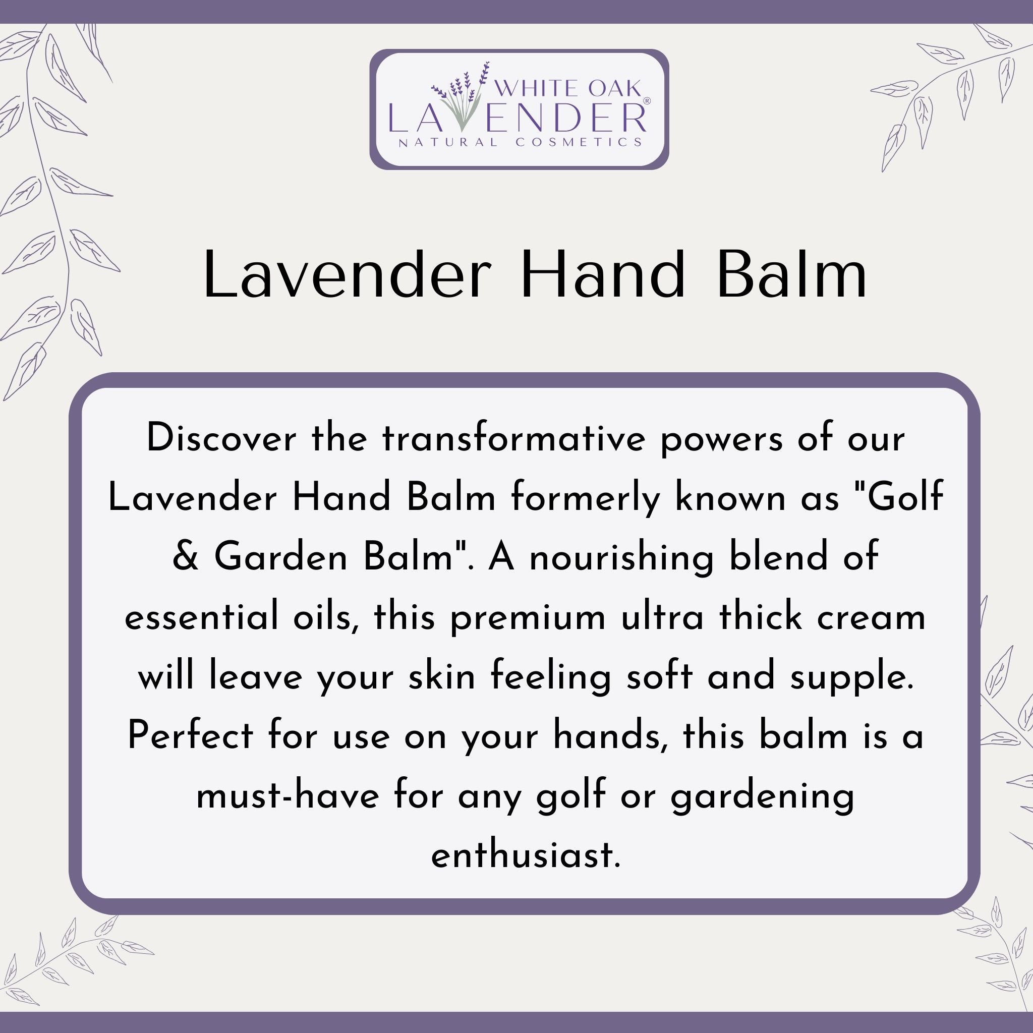 Discover the transformative powers of our Lavender Hand Balm formerly known as "Golf & Garden Balm". A nourishing blend of essential oils, this premium ultra thick cream will leave your skin feeling soft and supple. Perfect for use on your hands, this balm is a must-have for any golf or gardening enthusiast.